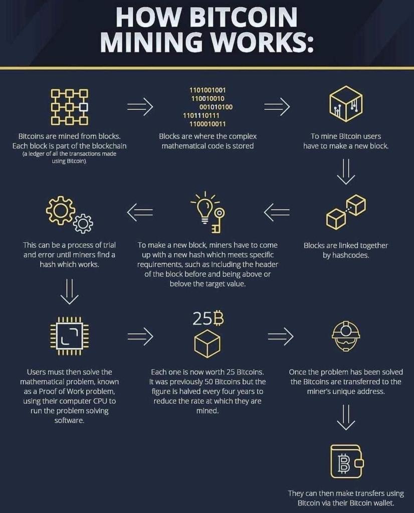 Bitcoin mining is the process by which new bitcoins are created and added to the circulating supply. It also serves as the mechanism to validate and secure transactions on the Bitcoin network. Mining involves solving complex mathematical problems, and the participants in this process are called miners. Here’s how it works: